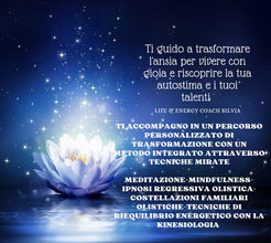 Il mio percorso si concretizza in sessioni di coaching, da effettuare tranquillamente online, che con l’ipnosi regressiva, le costellazioni familiari, meditazioni personalizzate, la lettura dei registri Akashici, diventa potente strumento di indagine e guarigione di traumi, paure, memorie per il tuo massimo benessere e per raggiungere i tuoi obiettivi di vita senza stress.